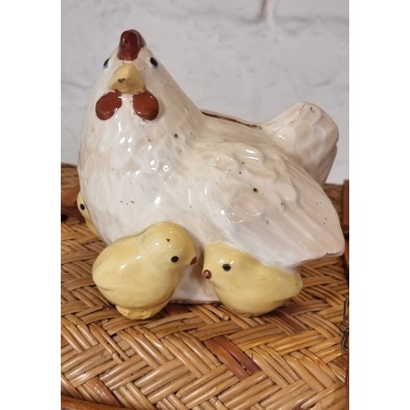 Gammel keramik sparebøsse fra Kähler, høne med kyllinger, mål: 14 x 14 cm.