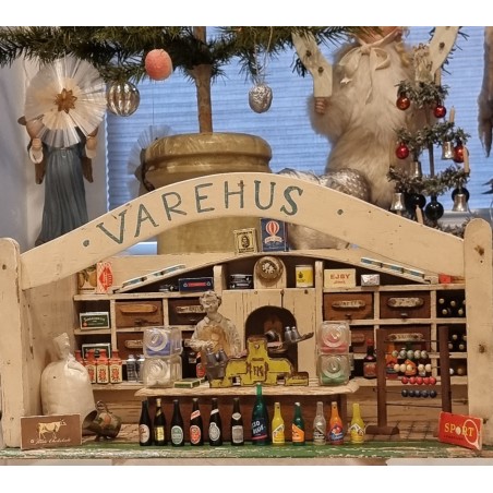 Gammelt varehus med varer mm., fængselsarbejde, mål: 42 x 23 x 22 cm.