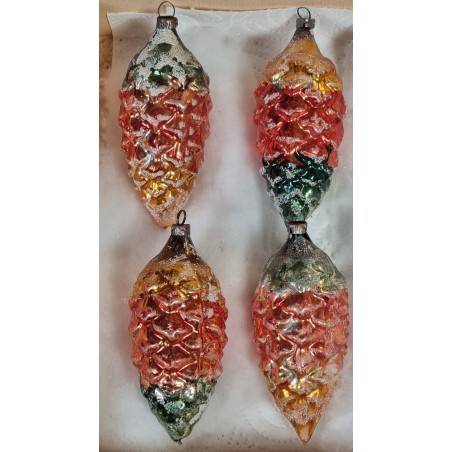 4 antique multicolored pine cones with snow, h: 8,5 cm. (4x).