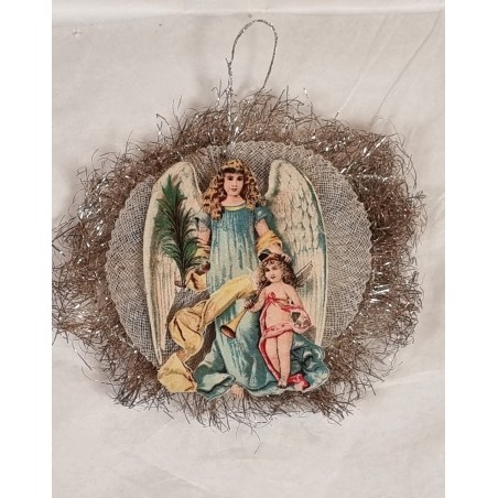 Antique tinsel/gauze ornament with angels and Dresden cardboard, size: 10 x 11 cm., h: