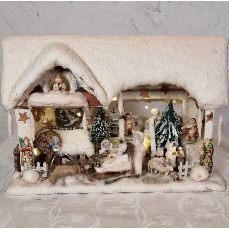 German snowhouse with 8 cotton dolls and 3 Wendt und Kühn angels, plays Christmas songs, size: 46 x 33 x22 cm.