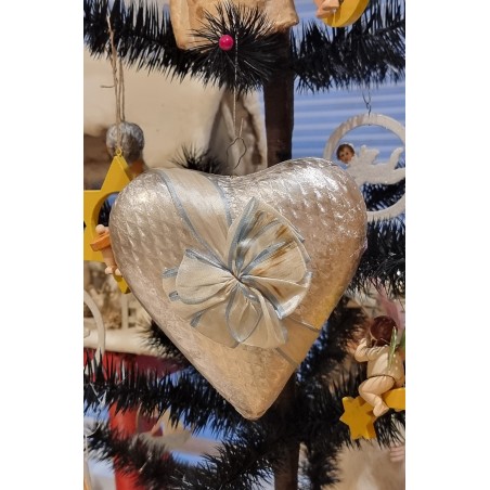Antique ornament, heart shaped candycontainer in foil and with a ribbon, h: 13 cm.
