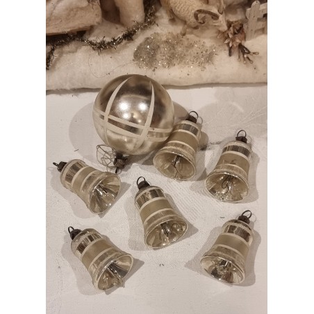 Collection of old glass ornaments, 6 bells and 1 ornament, h: 4 - 6 cm. (7x)