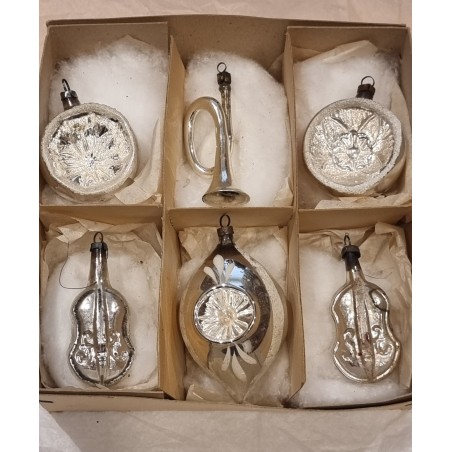 Box with old/antique glass ornament, silver ornaments, h: 5,5 - 8,5 cm.